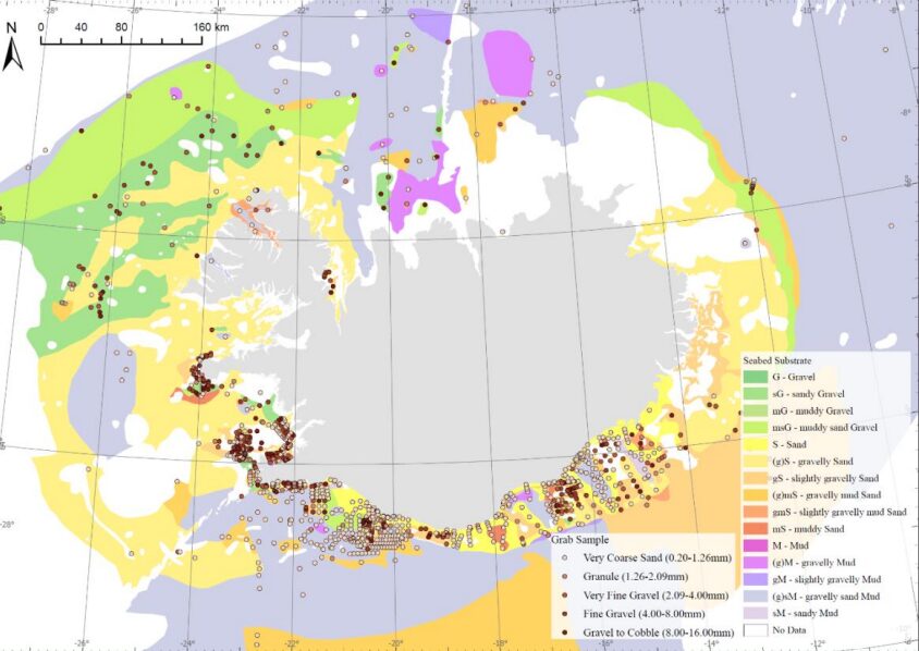 First, he mapped and classified the sediment on the ocean floor. He did this using grab samples, which is a sample of sediment at a specific location. He categorised the sediment classes into average grain sizes. Then he built a new substrate map for the Icelandic waters (see below). This is helpful for future research to be more precise when looking into the interactions of the trawling gear with the seafloor.