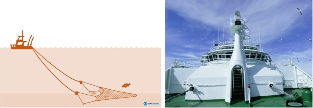 Bottom trawling is a fishing method where large nets, held open by heavy metal doors and weighted with chains, are dragged directly across the seafloor to catch bottom-dwelling fish (see figure below).