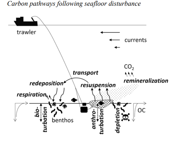 Mason’s results also show that bottom trawling can be a hidden driver of ocean carbon release that is stored in seafloor sediment. Our oceans are the largest natural carbon sink on the planet, absorbing and storing more carbon than any other system on Earth. As mentioned before, the dragging of heavy nets, doors, and chains along the seabed stirs up the sediments which will start floating in the water. With this sediment the carbon gets released as well. And as you might know, carbon release is a major driver of climate change. This figure below shows how bottom trawling disturbs the seafloor and releases carbon (CO2) into the ocean: